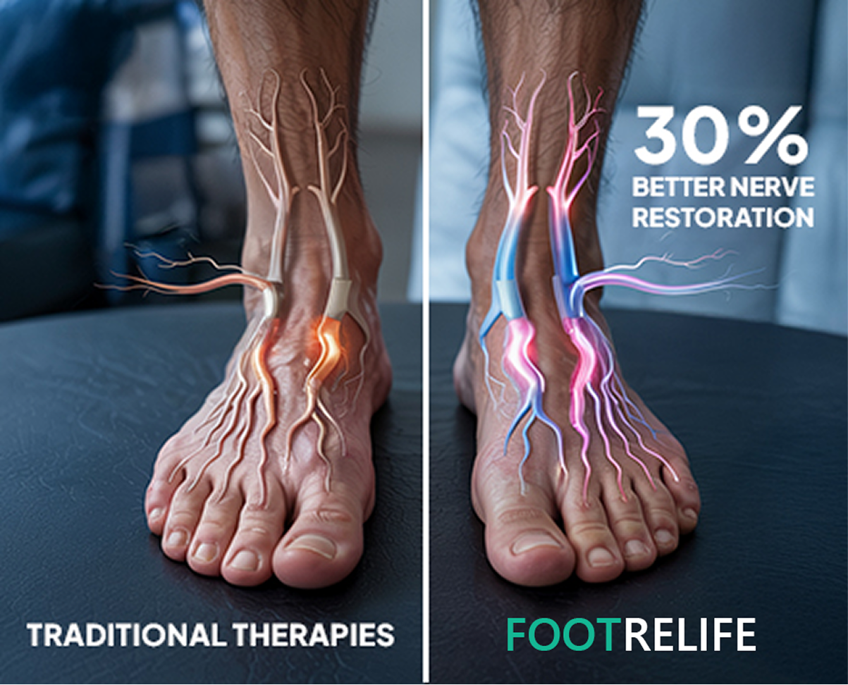Nerve damage affects over 200,000 nerve endings in each foot - creating the burning, tingling, and numbness that destroys quality of life. Clinical studies have confirmed that the revolutionary FootRelife Triple Method penetrates directly to these damaged nerve pathways, restoring up to 99.8% of normal sensation precisely where traditional treatments fail. The effect of improved circulation and nerve reactivation is visible in 198/200 people within 15 minutes of the first session.